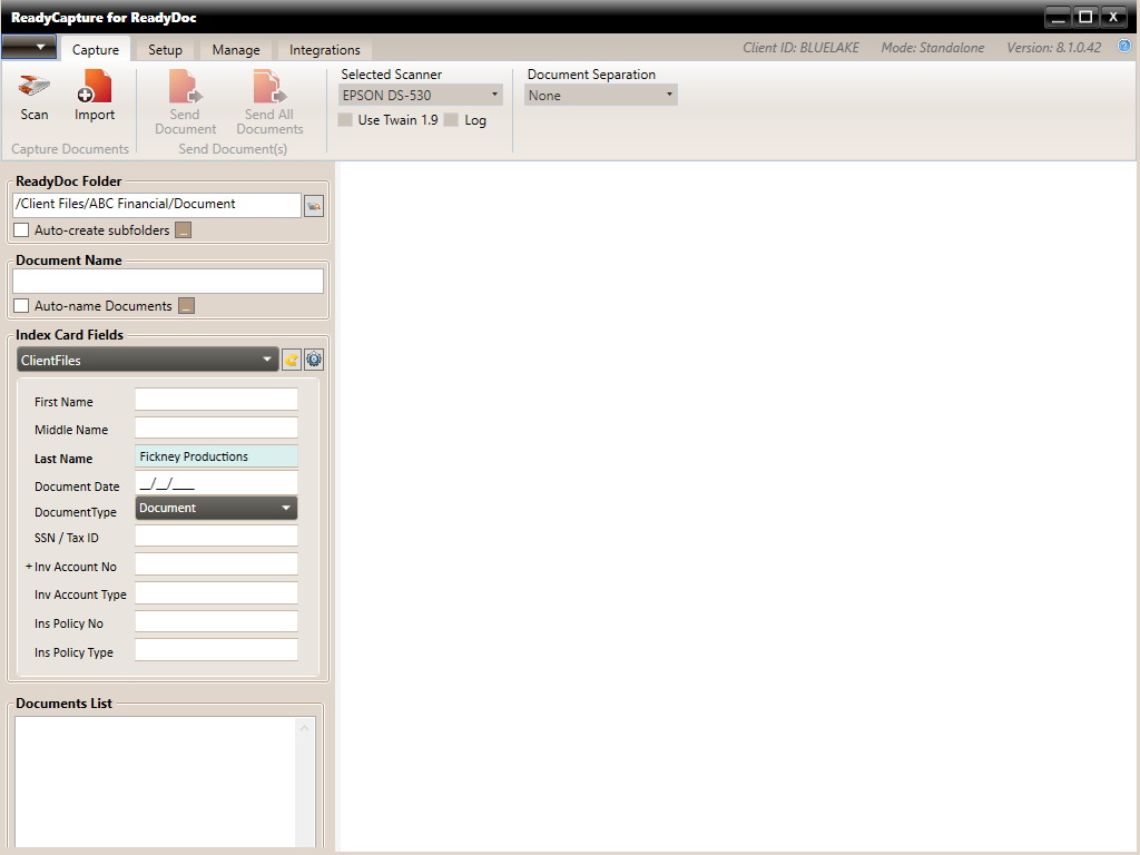The ReadyCapture desktop application will display with the selected client information pre-populated: